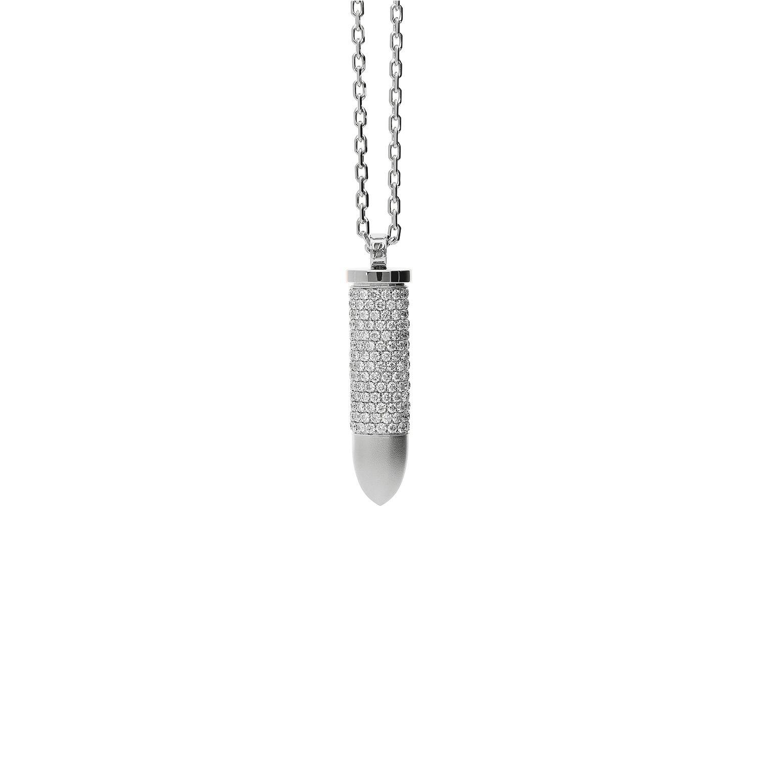 Bulletruth Collection Necklace in 18kt white gold 21,70g with body pavé and 4,68 ct GSI brilliant cut white diamonds. 70 cm total lenght